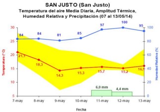 La humedad relativa ambiente fue alta durante la semana, en el centro del área, con valores que oscilaron entre 81 y 100 %, en el sector norte presentó similar comportamiento con valores entre 76 y 97 %, con una amplitud térmica de media a baja, fluctuante, con tendencia a disminuir al final de la misma en el sector norte y ampliarse en el centro del área.