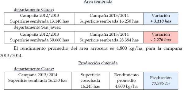 En el área arrocera (departamento Garay y departamento San Javier), finalizó el proceso de cosecha, con ello el ciclo del cultivo con un rendimiento promedio de 4.800 kg/ha para arroz largo fino y un rendimiento promedio de 3.800 a 4.000 kg/ha arroz largo ancho.
