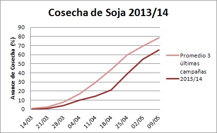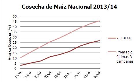 Con respecto a las labores de cosecha, la soja mostraba un avance de 68%, cuando a mitad de mayo el promedio de las últimas tres campañas marca un 80% recolectado. Las últimas lluvias en Córdoba y en el norte argentino mantendrán la demora de las labores en los próximos días. Pero es el cultivo de maíz donde más se nota el retraso a nivel nacional; sólo se recolectó el 30% del área cuando el año pasado a esta altura se había cosechado un 60% de la superficie.