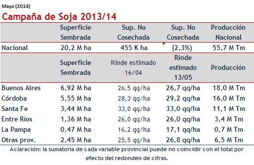 Se ajustó el área de siembra con soja de Salta, reduciéndolo de 500 a 450 mil ha, razón por la cual el total de siembra nacional disminuye. Tucumán y Salta dejaron atrás la peor campaña de su historia, la 2012/13, obteniéndose ahora rindes notoriamente mejores aunque inferiores a los niveles históricos (entre 27 y 30 qq/ha). Este año se obtendrían 24 y 23 qq/ha, como promedio provincial en cada una de ellas.