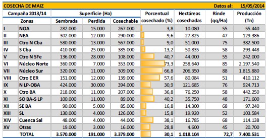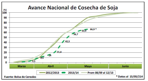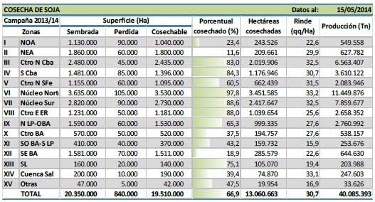 En números absolutos se recolectaron más de 13 MHa y a medida que la cosecha avanzó, el rinde promedio nacional fue registrando una lenta caída y hoy se ubica en 30,7 qq/Ha. El volumen parcialmente acumulado al presente informe ya supera las 40 MTn y la proyección al cierre de campaña se mantiene en 55.500.000 toneladas, que de concretarse marcaría un nuevo récord de producción nacional, al superar el volumen recolectado durante la campaña 2009/10 (Cosecha 2009/10: 55 MTn.). En comparación al ciclo previo, la actual proyección de cosecha representa un incremento interanual de 14,4 %.