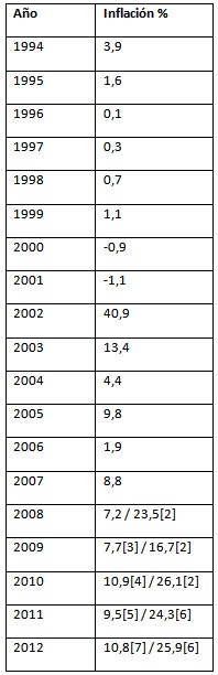 1. Tabla con tasas de inflación entre 1945 y 2007, en el sitio web de Eva Row. Basado en los datos del sitio web del INDEC. 2 «Argentina IPC General». The Billion Prices Project @ MIT. 3. «La inflación anual fue de 7,7 por ciento». Diario Página/12 (15 de enero de 2010). 4.Según el INDEC, la inflación fue de 10,9% en 2010». Diario Ámbito Financiero (15 de enero de 2011). 5. «Según el Indec la inflación de 2011 fue del 9,5 por ciento». Diario Página/12 (13 de enero de 2012). 6.«Economic and financial indicators». The Economist. 7.«Según el Indec, la inflación de 2012 fue del 10,8%». Diario Ámbito Financiero (15 de enero de 2013).