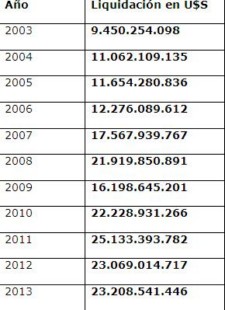La liquidación de divisas de las empresas del sector en los últimos años fue: