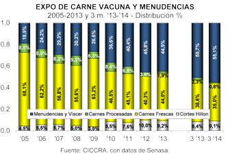 En tanto, conforme avanza el año cada vez se realizan menos negocios con el resto del mundo. En enero-abril de 2014 las colocaciones de carne vacuna en el exterior habrían totalizado apenas 49 mil tn r/c/h, volumen que sería 21,8% inferior al registrado en igual cuatrimestre del año pasado (-13,7 mil tn r/c/h). La importancia relativa en la oferta total bajó a 5,6% (-1,3 puntos porcentuales con respecto a igual lapso de 2013).