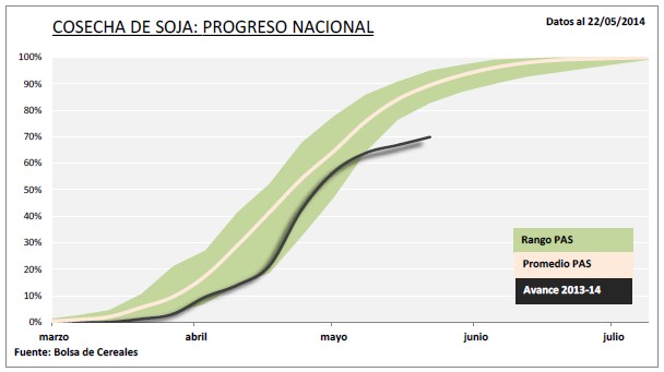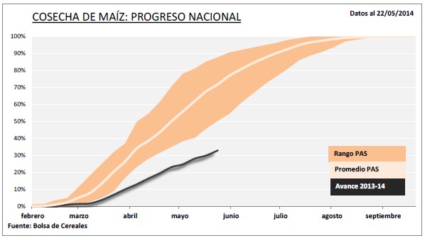 Durante los últimos siete días se registraron avances de cosecha sobre el margen oeste agrícola, donde las lluvias se dieron de manera leve. En números absolutos se han recolectado 1.100.000 hectáreas las que aportan un volumen en chacra de 8 MTn y un rendimiento medio de 72 qq/Ha.
