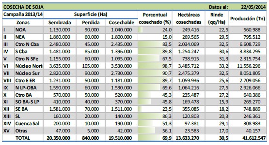 Por otra parte, se comenzaron a recolectar cuadros en el NOA, más precisamente en Las Lajitas y aledaños, donde los rendimientos de los cuadros sembrados en fechas tempranas rondaron los 58 qq/Ha. Si bien esta región no fue la más beneficiada con las lluvias de verano respecto del resto del área, las productividades obtenidas hasta ahora son buenas.