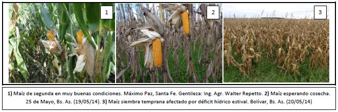 Hoy el grueso de los cuadros sembrados en fechas tardías o de segunda ocupación se encuentra en madurez fisiológica perdiendo humedad en el grano. Lotes puntuales sembrados de manera muy tardía durante el mes de febrero se encuentran finalizando la etapa de llenado, en grano pastoso a duro. La generalidad que hoy se puede apreciar es la de una gran demora en la fecha de recolección de estos cuadros, debido a la época del año y a las condiciones climáticas dadas de ahora en más. La mayor dificultad se va a dar en la pérdida de humedad en los granos y en la posibilidad de ingresar con los equipos de trilla al campo. También se puede observar una gran preocupación por parte del productor, dado que se comienza a observar ataques de hongos en la espiga del maíz.