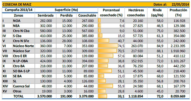 En el Sur de Córdoba continuaron recolectando algunos lotes de maíz tardío, los cuales arrojaron productividades buenas para lo que fue la campaña (60-70 qq/Ha). De igual modo, la recolección se encuentra demorada a causa de los excesos hídricos provocados por las continuas lluvias caídas. Por último otras zonas donde intentaron retomar de manera fluida la recolección de lotes tardíos y la lluvia los interrumpió fueron el Centro-Este de Entre Ríos, el núcleo Sur y la Cuenca del Salado. Los lotes que lograron cosecharse denotaron muy buenos rendimientos, con lo cual, el productor está deseoso de poder recoger los cuadros que aún poseen en pie.