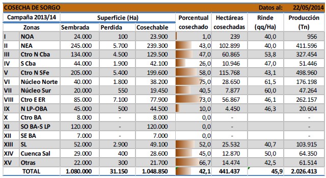 En la región NEA se ha dado inicio a la cosecha de lotes tardíos. En la presente campaña la siembra de sorgo granífero es un 6,5 % superior a la registrada el ciclo precedente (245.000 Ha vs. 230.000) y los rendimientos relevados hasta el momento vienen siendo un 14% superiores a los registrados en el ciclo 2012/13 (40 qq/Ha. vs 35 qq/Ha). La sobreproducción regional incrementaría mucho la oferta del cereal y como respuesta a esto, algunos productores han empezado a confeccionar silo de planta entera con lotes que inicialmente habían sido sembrados con destino grano comercial.