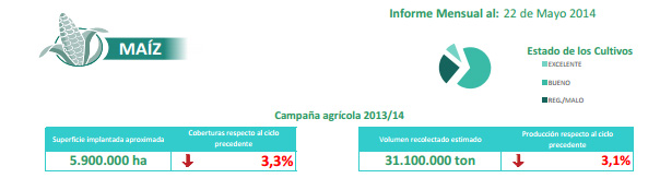 El dato particular reside en el Maíz, para la campaña agrícola 2013/14, del cual, según el informe de la subsecretaría, se alcanzaría una producción al menos similar a la indicada en abril y se ubicaría alrededor de las 31,1 millones de toneladas (M/Tns).