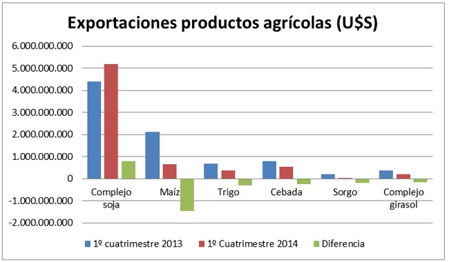 b) A pesar de que el complejo sojero tuvo mayores exportaciones en el 1º cuatrimestre de 2014 comparado con el mismo período de 2013, el resultado final teniendo en cuenta los 6 principales cultivos agrícolas del país es negativo.