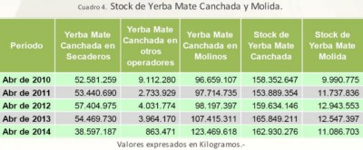Otros indicadores que permiten observar el movimiento de la actividad yerbatera son los stocks existentes de yerba mate canchada y de yerba mate molida. En tal sentido, el stock de yerba mate canchada en secaderos al mes de Abril de 2014 ascendió a 38.597.187 Kilogramos, mientras que los molinos contaban con un stock de 123.469.618 kilogramos y el stock en poder de otros operadores fue de 863.471 Kilogramos. Por otra parte, en cuanto a la yerba molida, al mes de Abril de 2014 la industria mantuvo un stock de 11.086.703 kilogramos.