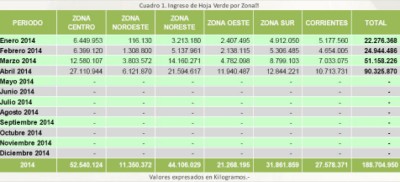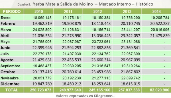 Los datos estadísticos registrados por el Instituto Nacional de la Yerba Mate (INYM) revelan que durante el mes de Abril de 2014 el volumen de yerba mate elaborada a salida de molino alcanzó los 21.475.839 Kilogramos. Sumado a los meses anteriores las salidas con destino al mercado interno totalizan 82.020.906 Kilogramos para el período Enero-Abril de 2014.Cabe recordar que el movimiento de yerba mate a salida de molino es el indicador más cercano al comportamiento de la yerba mate en góndola, ya que incluye tanto el volumen que se envía a los centros de distribución de las firmas yerbateras como las compras efectuadas por los mayoristas, hipermercados y supermercados.