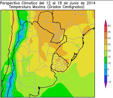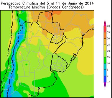 La mayor parte del Paraguay, el nordeste de Salta, el sur de Misiones, el norte de Corrientes, la mayor parte de la Región del Chaco, el este de Santiago del Estero, el nordeste y el centro de Santa Fe y el norte del Uruguay, observará temperaturas máximas superiores a 25ºC. El sudeste del Paraguay, el este del NOA, el sur de la Región del Chaco, la mayor parte de Santa Fe, el centro de Cuyo, el norte de la Región Pampeana, la mayor parte de Misiones, el sur de Corrientes y la mayor parte del Uruguay, observarán temperaturas máximas entre 20 a 25°C.