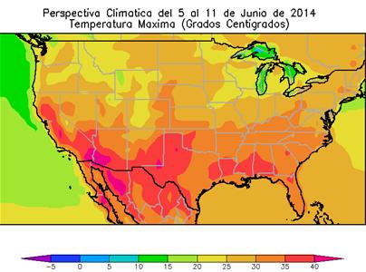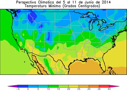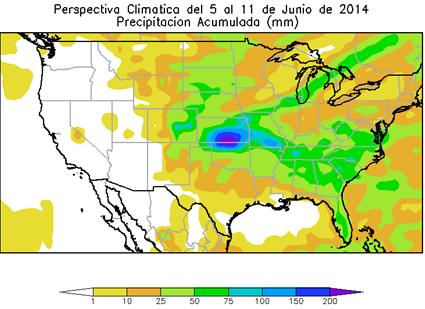 La perspectiva comenzará con varios sistemas frontales que producirán precipitaciones de muy variada intensidad en la mayor parte del área agrícola norteamericana. Paralelamente, se producirá la entrada de una vigorosa masa de aire polar, que hará descender las temperaturas mínimas por debajo de lo normal para la época. La mayor parte del área triguera y el cinturón maicero, observará temperaturas máximas superiores a 25 °C. Estas temperaturas causarán una elevada evapotranspiración que provocará un consumo de humedad superior al aporte de las lluvias. Este proceso será acompañado por una sucesión de fenómenos extemporáneos, dando un ambiente muy perturbado: Viernes 6 de Junio: Condiciones de tiempo crudo y severo al centro-sur de las Planicies y el Valle de Misisipi; Sábado 7 de Junio: Tiempo crudo en el centro de las Planicies; Viernes 6 y sábado 7 de junio: Lluvias intensas en Dakota del Sur y el norte de Nebraska; Viernes 6 y sábado 7 de junio: Lluvias intensas en el centro de las Planicies y la mitad del Valle de Misisipi; Domingo.8, lunes 9 de junio: Lluvias intensas desde la porción inferior del sur de las Planicies hasta el centro de Kentucky y el centro de Tennessee; Viernes 6 de Junio: Riesgo de incendios sobre sectores de Arizona y Nueva México; Viernes 6 y Domingo. 8 de Junio: Inundaciones inminentes en el sur de Wyoming; Viernes 6 y Domingo. 8 de Junio: Posibles inundaciones en el noroeste de Colorado; Viernes 6 y Domingo. 8 de Junio: Posibles inundaciones en partes de la mitad del Valle de Misisipi; Sequía severa para partes de las Grandes Planicies, el Sudoeste, el Noroeste del Pacífico, la Gran Cuenca y California.