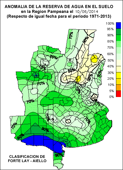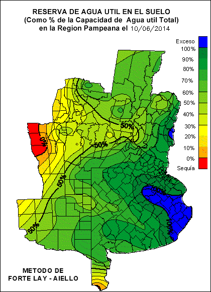 RESERVA DE AGUA ÚTIL EN EL SUELO (como % de la capacidad de agua útil total) en la Región Pampeana el 10 de Junio de 2014