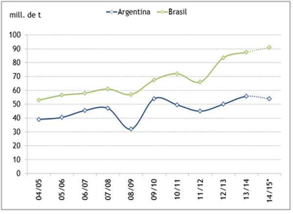 Sin embargo, los efectos de factores climáticos adversos ya quedaron atrás, dado que en el ciclo 2013-14 la cosecha estadounidense alcanzó a 90 mill. de t, mientras que en Sudamérica se superaron las 150 mill. de t. De todas formas, los precios se han mantenido elevados en función de un balance de oferta y demanda muy ajustado para la soja estadounidense, que ha llevado a ese país a tener que importar más de 2 mill.de t. de soja hasta el momento, para compensar su déficit interno, ya que sus exportaciones superaron las previsiones.