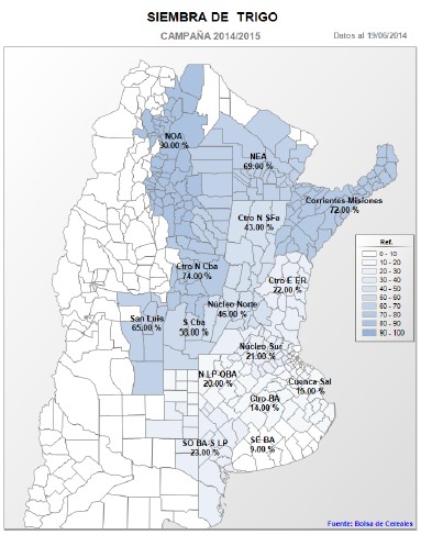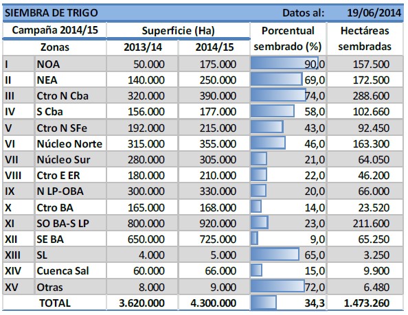 Clima favorable mediante, la siembra de trigo avanzó con gran fluidez sobre extensas áreas del territorio nacional, tal es así que en las regiones norteñas las labores de implantación avanzaron más de 20 puntos porcentuales. A la fecha se sembró el 34,3 % de las 4.300.000 hectáreas estimadas para la presente campaña. Dicha superficie se ubica un 18,8 % por encima de la implantada el ciclo previo (campaña 2013/14: 3.62 MHa).