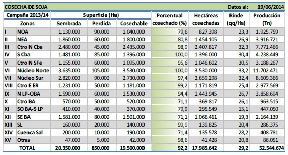 En números absolutos se llevan cosechadas 1,5 millones de hectáreas, acumulando un volumen en chacra de 11 millones de toneladas, las cuales aportan un promedio de rinde nacional de 74,4 qq/Ha. El retraso interanual continúa siendo muy marcado, siendo a la fecha de -27,4 puntos porcentuales.