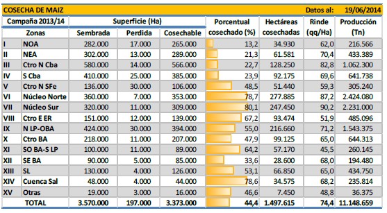 Durante los últimos siete días no se registraron lluvias en el norte del área agrícola nacional. En el NOA, NEA, Centro-Norte de Córdoba y Centro-Norte de Santa Fe se registraron progresos en las labores de cosecha de maíz con destino grano comercial. De esta manera, el avance semanal fue de 2,8 %, habiéndose recolectado a nivel nacional el 44,4 % del área apta a cosecha.