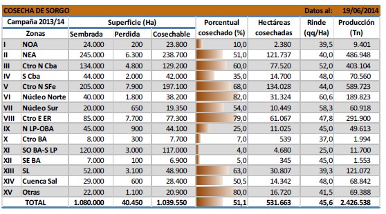 Se continúa con la trilla de sorgo granífero; a la fecha se lleva recolectado el 51,1 % de la superficie nacional, proyectada para esta campaña en 1,08 millones de hectáreas. En cuanto al rendimiento obtenido, este se ubica en 45,6 qq/Ha, lo cual hace que el volumen acumulado en chacra sea de 2,4 MTn.