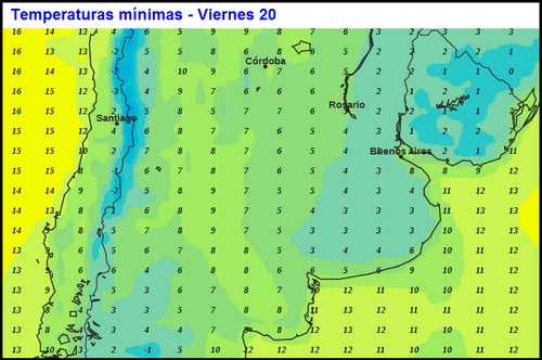 La buena noticia es que por estas horas el viento ya está rotando al sector oeste y noroeste en la región bonaerense y con eso ya las temperaturas matinales irán recuperándose como se ve en el mapa de mínimas estimadas para este viernes 20/6.