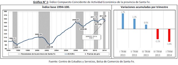 De acuerdo al Índice Compuesto de Actividad económica de Santa Fe (ICASFe), dependiente de la Bolsa de Comercio de esa provincia, la actividad económica registró el segundo trimestre consecutivo de caída, acumulando una disminución del -2,4% entre septiembre de 2013 y marzo de 2014. Particularmente durante dicho mes seis de los catorce sub-indicadores representativos de la actividad económica provincial presentaron tasas mensuales negativas. Sin embargo, en la comparación inter-anual son nueve las series que se encuentran debajo del nivel que tenían en marzo de 2013.