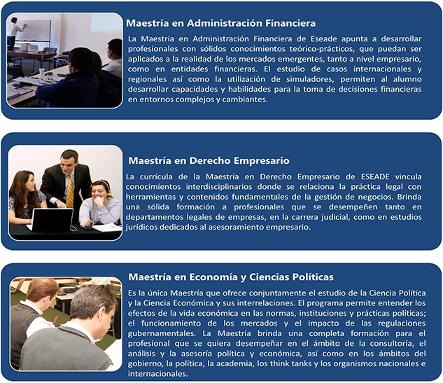 Mba - MaestrÍa en AdministraciÓn de Negocios El MBA de ESEADE, apunta a las cuestiones esenciales de la administración de empresas, desde la formulación y ejecución de estrategias hasta los complejos asuntos del liderazgo y la conducción de RRHH, pasando por el marketing y la contabilidad gerencial. Un MBA, personalizado a precios accesibles, que pone énfasis especial en la interrelación de los aspectos económicos, políticos y sociales que afectan al mundo global de los negocios y de la empresa. |