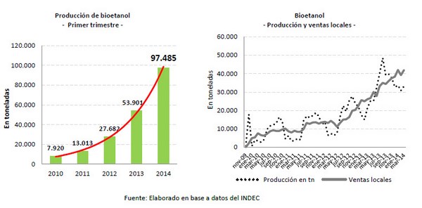 La producción de bioetanol alcanzó las 97.485 toneladas en los primeros tres meses de 2014 y casi se duplicó respecto del mismo período de 2013 (+80,9%).