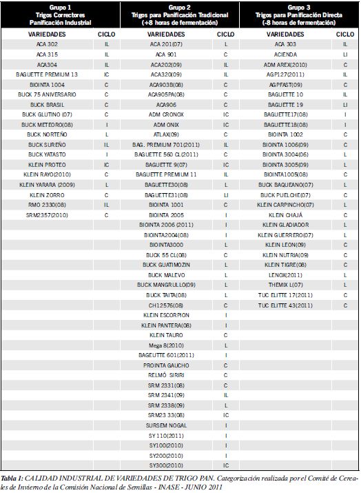 Las diferencias entre variedades se basan en su distinta composición bioquímica, por lo que se agrupa a las variedades comerciales de acuerdo con su similitud en calidad industrial por grupos de calidad (Tabla 1)