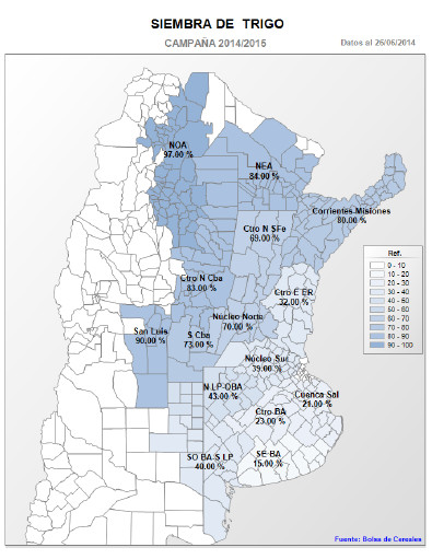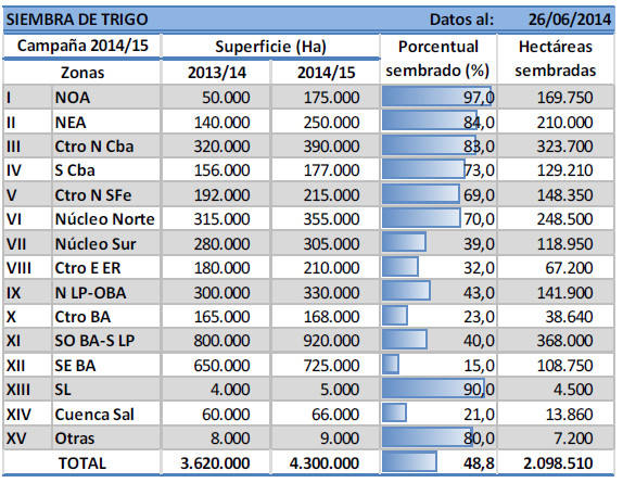 Como ya mencionamos, algunas regiones del país aún mantienen importantes problemas hídricos, los cuales están causando demoras en la siembra, lo que se suma a las dificultades para reemplazar los materiales largos por intermedios/cortos, haciendo que parte del área planificada con trigo quede libre para realizar cultivos de gruesa.