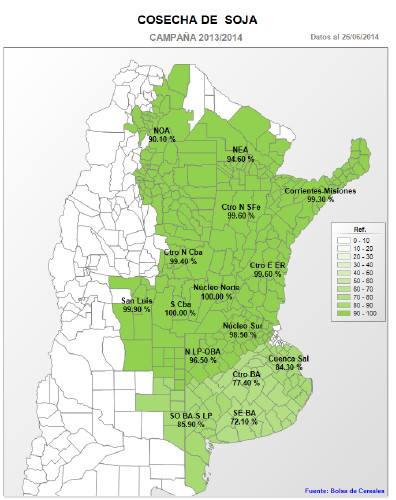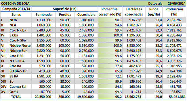 Estas, aportan un volumen en chacra de 12 MTn y el rinde promedio nacional se ubica en 74,1 qq/Ha al presente informe. Por otra parte, los buenos resultados obtenidos hasta el momento en los cuadros de fechas tardías en las zonas Núcleo, Córdoba, Norte de Santa Fe y en el Oeste de Buenos Aires, apalancan nuestra proyección de producción para fin de campaña en 25.000.000 de toneladas. De lograrse este volumen, estaríamos un -7,4 % por debajo de lo producido la pasada campaña (2012/13: 27 MTn).