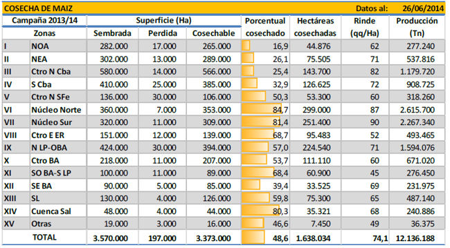 Durante los últimos siete días la trilla de maíz con destino grano comercial registró un avance de 4,2 puntos porcentuales. De todos modos, la recolección es lenta en comparación a la registrada a misma fecha de la pasada campaña (27/06/2013: 76,9 % de avance); esto se debe a un mayor porcentaje de siembras tardías, sumado a los excesos de humedad registrados durante los meses de otoño en el presente ciclo. A nivel nacional se lleva cosechado el 48,6 % del área apta, que en números absolutos representa más de 1,6 millones de hectáreas.