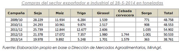 Las compras por parte del sector exportador e industrial al 28 de mayo de 2014 de los cuatro principales cultivos resulta inferior al volumen comercializado al mismo momento del año para la precedente campaña.