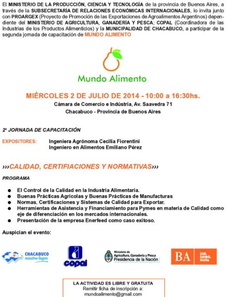 El Ministerio de la producción, Ciencia y Tecnología de la provincia de Buenos Aires invita a participar de la segunda jornada de capacitación de Mundo Alimento el próximo miércoles 2 de julio de 10 a 16.30 horas en la Cámara de Comercio e Industria.