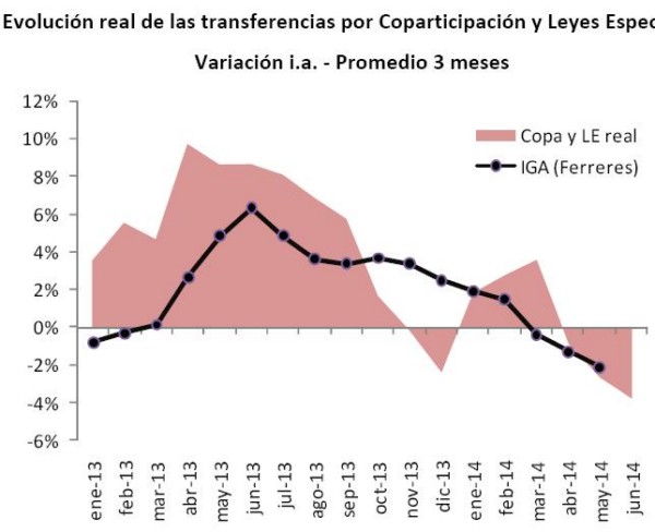 De acuerdo a cifras oficiales, las transferencias fiscales a provincias en concepto de coparticipación y leyes especiales crecieron nominalmente 8 puntos porcentuales menos que la inflación anual en junio 2014, la mayor brecha entre ambas variables en lo que va del año,según informó Fundación Mediterránea.