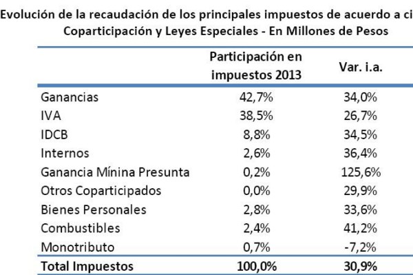 El detalle de las cifras de coparticipación permite, además, aproximar la evolución de lo aportado por los principales impuestos (existen algunas diferencias con las cifras que publica finalmente la AFIP, y no se incluyen recursos de la seguridad social). Se destaca Ganancias que crecería alrededor del 34% anual, similar a la evolución del IDCB, mientras el IVA lo haría un 26,7% (salvo que haya sido compensado por menores reintegros y devoluciones a exportadores), en todos los casos por debajo de la inflación anual del período, por ende con reducciones en valor real.
