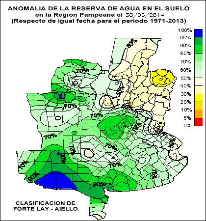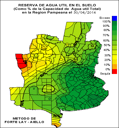 RESERVA DE AGUA ÚTIL EN EL SUELO (como % de la capacidad de agua útil total) en la Región Pampeana el 30 de Junio de 2014
