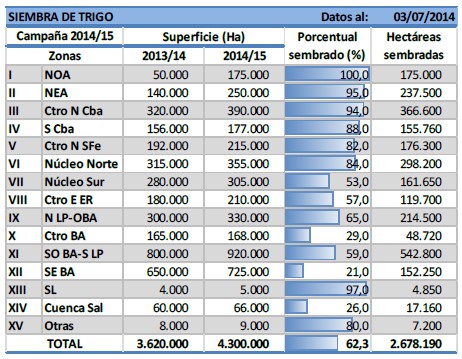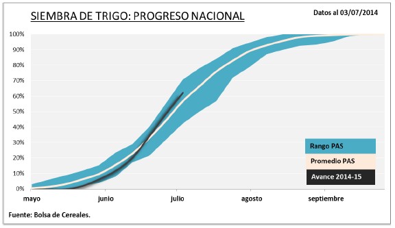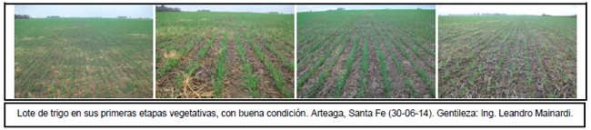 Luego de un período de 20 días sin lluvias en el área agrícola nacional, excepto en el NOA (15 a 25 mm) y en parte de la provincia de Buenos Aires (menores a 15 mm), los cuadros destinados a trigo lograron drenar y ello permitió un fluido progreso de siembra. Tal es así que semana a semana las zonas comprometidas con excesos hídricos como el Centro-Este de Entre Ríos, Núcleo Sur, Centro y Sudeste de Buenos Aires, mejoraron notoriamente la condición hídrica para la siembra. No obstante, algunas regiones no pudieron cubrir el área planeada con ciclos largos, pero la intención es reemplazar por ciclos intermedios y cortos, siempre y cuando exista disponibilidad suficiente de estos materiales.