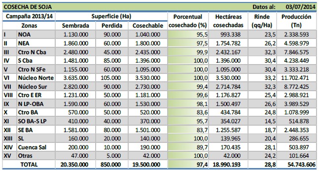 Las zonas Centro-Norte de Córdoba y Centro-Norte de Santa Fe llevan cosechadas alrededor de 105 y 165 mil hectáreas respectivamente. Estas zonas registran un avance de trilla del 85 % cada una, quedando por trillar para el caso del Centro-Norte de Córdoba, lotes ubicados en el departamento de Río Primero y cuadros puntuales sobre la margen centro-este de la provincia. En cambio, en el Centro-Norte de Santa Fe, los cuadros pendientes de trilla están distribuidos sobre toda la región, siendo lotes que presentan inconvenientes por encontrarse con excesos hídricos.