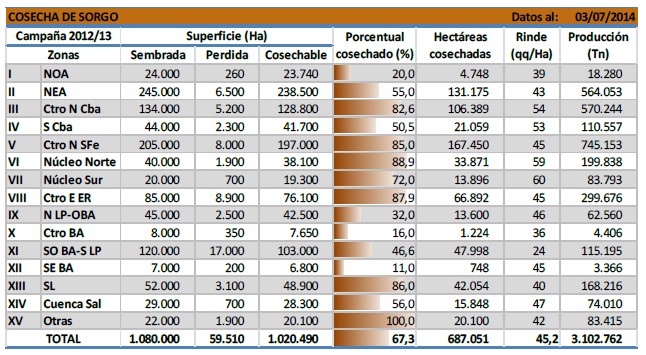 Aprovechando la ausencia de precipitaciones durante la última quincena, y en conjunto con una trilla de soja ya avanzada, la cosecha de sorgo granífero ha cobrado gran fluidez. A la fecha se lleva recolectado el 67,3 % de la superficie apta a nivel nacional, proyectada para esta campaña en 1,08 millones de hectáreas. El rendimiento medio obtenido se ubica en 45,2 qq/Ha, lo cual hace que el volumen acumulado en chacra sea de 3,1 MTn.