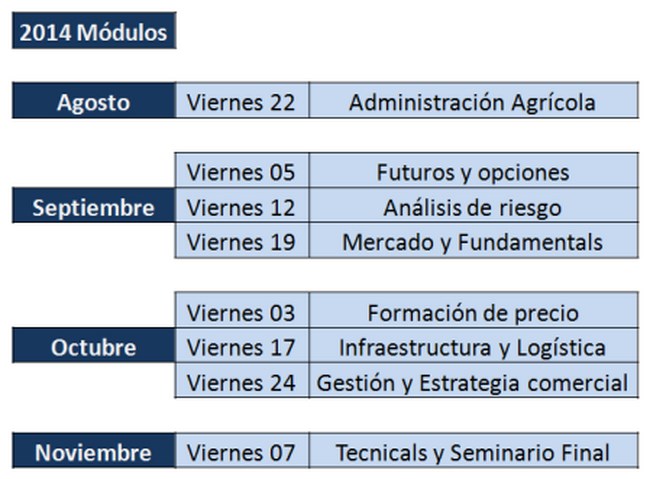 Junto con la consultora Agro-Gestión, la consultora Globaltecnos S.A. desarrolló una serie de ocho jornadas a realizarse los días viernes entre el 22 de agosto y 7 de octubre de 2014, aprovechando los aprendizajes de más de 15 años de trabajo con productores agropecuarios en la comercialización granaria. En su edición 2014, el curso será dictado en Rio IV, Córdoba.