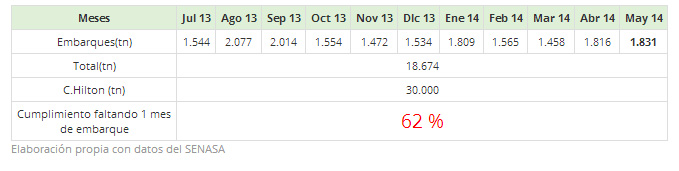 Con los últimos datos del SENASA de las exportaciones del mes de mayo 2014, podemos calcular el nivel de cumplimiento del país con la UE por la Cuota Hilton. Faltando un mes para que se terminen los embarques solo hemos cumplido con el 62 % de la Cuota.