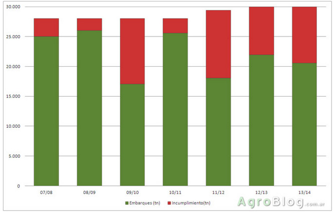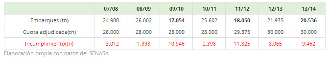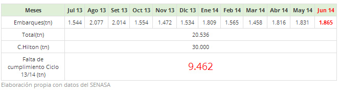 Si en Junio 2014 se embarcara –el tonelaje de lo embarcado en dicho mes SENASA lo da a conocer alrededor del 25 de Julio 2014- lo mismo que en junio 2013, la falta de cumplimiento sería de 9.462 tn.