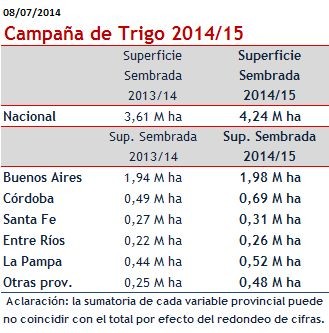 Si bien los guarismos de superficie del trigo 2014/2015 seguirán revisándose mensualmente, hasta llegar a la configuración final, en el presente informe se estima un área total de 4,24 millones de hectáreas, lo cual es un 17% superior a los 3,61 millones de hectáreas cultivadas en la campaña anterior.