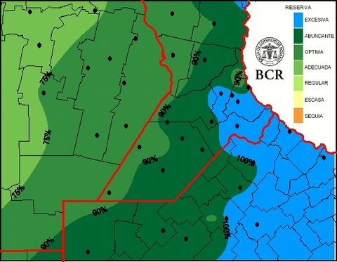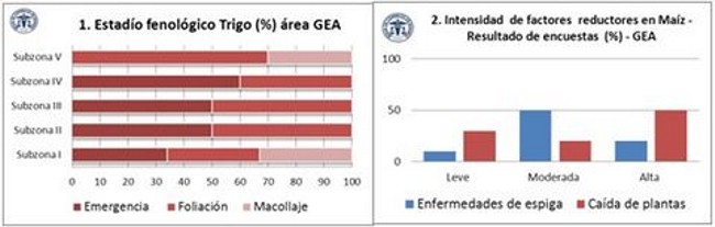 En el norte de Buenos Aires hay cuadros trigueros que muestran fallas en la germinación por los excesos hídricos, impidiendo el adecuado cierre del surco ante el paso de la sembradora y la oxigenación necesaria para desencadenar los mecanismos de germinación (ver mapa de reservas de agua). Los trigos que han logrado germinar sin problemas están creciendo rápidamente en muy buenas condiciones. Los estadios fenológicos se particionan en igual proporción entre emergencia y foliación (ver gráfico 1.). Los primeros lotes sembrados comienzan a macollar pero las temperaturas óptimas de esa etapa rondan los 8°C.