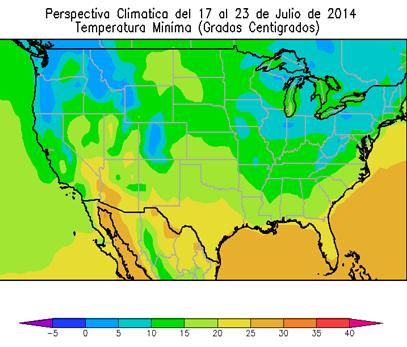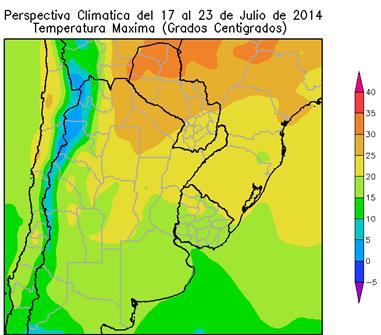 En el inicio de la perspectiva e completará el paso de un frente frío, que en el final de su recorrido provocará precipitaciones intensas sobre el sur del área triguera, el Delta y la Región Sudeste. Junto con el frente de tormenta, llegarán los vientos del norte, que provocarán temperaturas mínimas algo por debajo de lo normal. Hacia mediados de la perspectiva, retornarán los vientos del sur, provocando un marcado ascenso de la temperatura, dando inicio a un prolongado lapso cálido con registros muy elevados. Este proceso incluirá algunos fenómenos extemporáneos: Julio 19-20: Lluvias intensas en la Región Sudeste; Inundaciones en partes de Dakota del Norte y el curso medio del Mississippi; Sequía severa en parte de las Grandes Llanuras, la Región Sudoeste y la Gran Cuenca.
