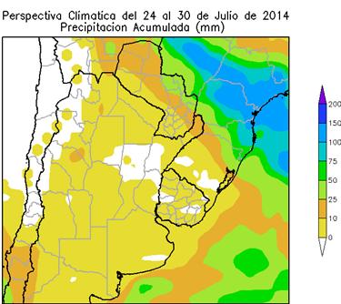 Perspectiva Agroclimática del 24 al 30 de julio de 2014: Precipitaciones sobre el extremo nordeste del área agrícola, seguidas por un marcado descenso térmico con posibles nevadas sobre gran parte de la Argentina y el sur del Uruguay
