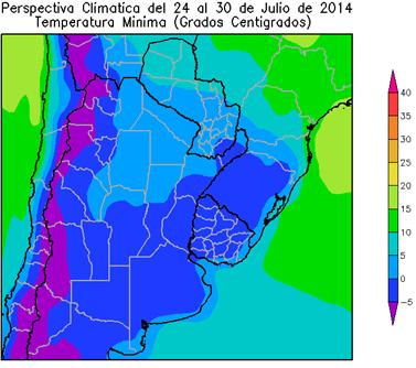 Sólo el extremo occidental del Paraguay, el extremo oriental del NOA, el extremo occidental de la Región del Chaco y algunos focos aislados observarán temperaturas mínimas superiores a 10ºC. El este del NOA, la mayor parte de la Región del Chaco, la mayor parte de la Mesopotamia, el extremo nordeste de Cuyo, el norte de la Región Pampeana y la mayor parte del Uruguay observarán temperaturas mínimas entre 5 y 10ºC, con leve riesgo de helada localizadas.