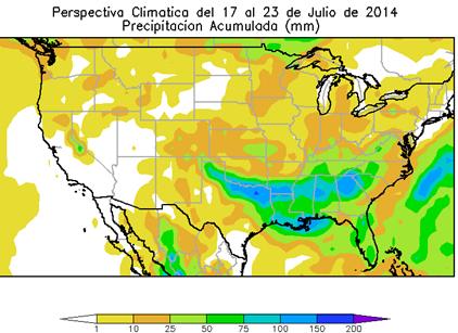 Perspectiva Agroclimática para los EE.UU. del 17 al 23 de julio de 2014: Tiempo fresco con lluvias sobre el sur del área agrícola norteamericana, seguido por un intensa ola de calor